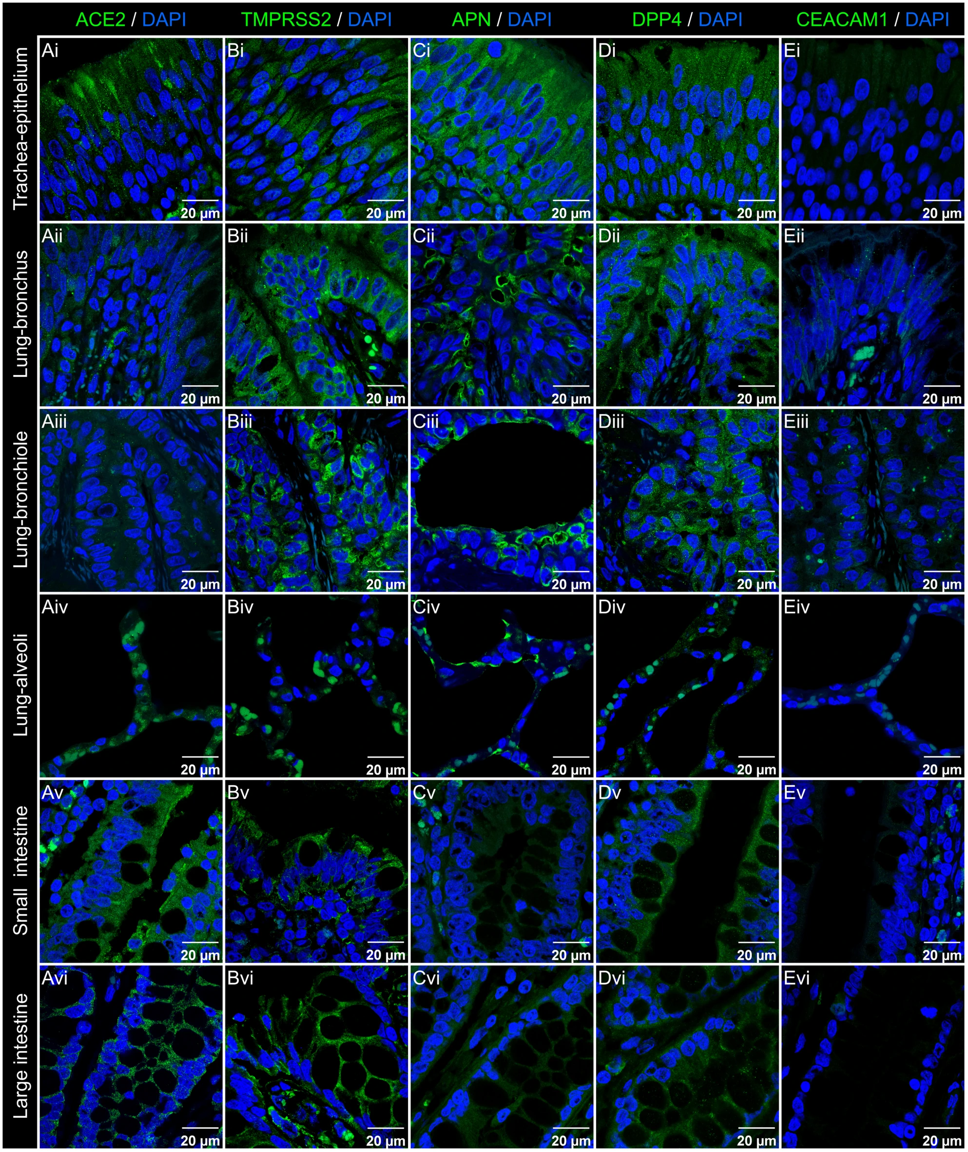 TMPRSS2, APN i DPP4 són àmpliament expressats en l’epiteli respiratori, i especialment en els alvèols. En l’epiteli intestinal, TMPRSS2 i DPP4 tenen una expressió uniforme, tant en la regió de les vellositats com en les criptes. CEACAM1 és present en el tracte respiratori però no se’l detecta en el tracte intestinal.