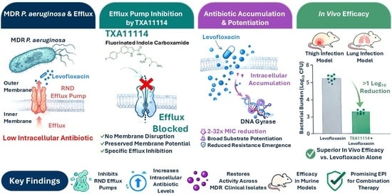 P. aeruginosa DA7232 és altament resistent a la levofloxacina degut a mutacions en la ADN-girasa (gyrA-T83I) i la topoisomerasa IV (parC-S80L). No obstant, quan TXA11114 assoleix una concentració de 6,25 µg/mL n’hi ha prou amb 1 µg/mL de levofloxacina per inhibir aquesta soca bacteriana. La fluorescència indica que aquest efecte és degut a una acumulació intracel·lular de levofloxacina.